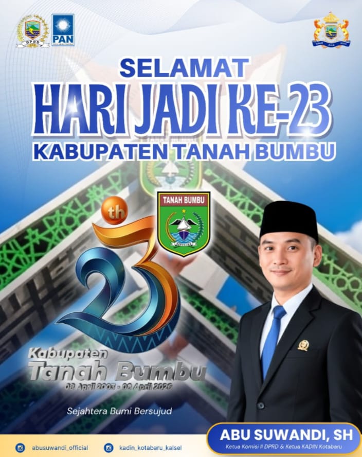 Kotabaru,KabarOnenews.com- Ketua Komisi II DPRD Kabupaten Kotabaru dari Partai Amanat Nasional (PAN), Abu Suwandi, SH, menyampaikan ucapan selamat Hari Jadi ke-23 Kabupaten Tanah Bumbu yang diperingati, Rabu (8/4/2026).