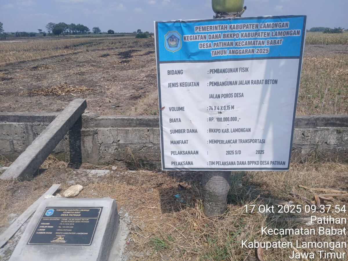 Lamongan, KabarOneNews.com-Kinerja Pemerintah Desa Patihan kecamatan Babat kabupaten Lamongan, menuai sorotan tajam dari masyarakat. Hal tersebut di karenakan proyek pembangunan Jalan poros desa yang di biayai dari Bantuan keuangan (BK) senilai RP. 100.000.000 juta, itu baru dua minggu, namun kondisinya sudah rusak parah, terlihat sudah retak, patah Rabat beton yang sudah pecah dalam waktu singkat,oleh karena Tim Inspektorat dan Badan pemeriksaan keuangan (BPK)di minta harus turun langsung ke Desa Patihan Kecamatan Babat kabupaten Lamongan untuk mengecek kembali proyek Rabat Beton yang dibangun beberapa minggu yang lalu. Jumat (17/10/2025 ).IMG 20251018 WA0002
