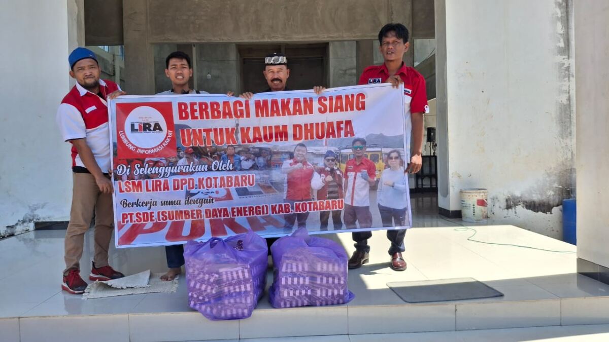 Kotabaru,KabarOnenews.com- Lembaga Swadaya Masyarakat (LSM) Lumbung Informasi Rakyat (LIRA) DPD Kotabaru bersama PT Sumber Daya Energi (SDE) menggelar kegiatan sosial dengan membagikan 100 nasi kotak kepada anak-anak yatim dan kaum duafa di wilayah Kotabaru, Minggu (20/7/2025).