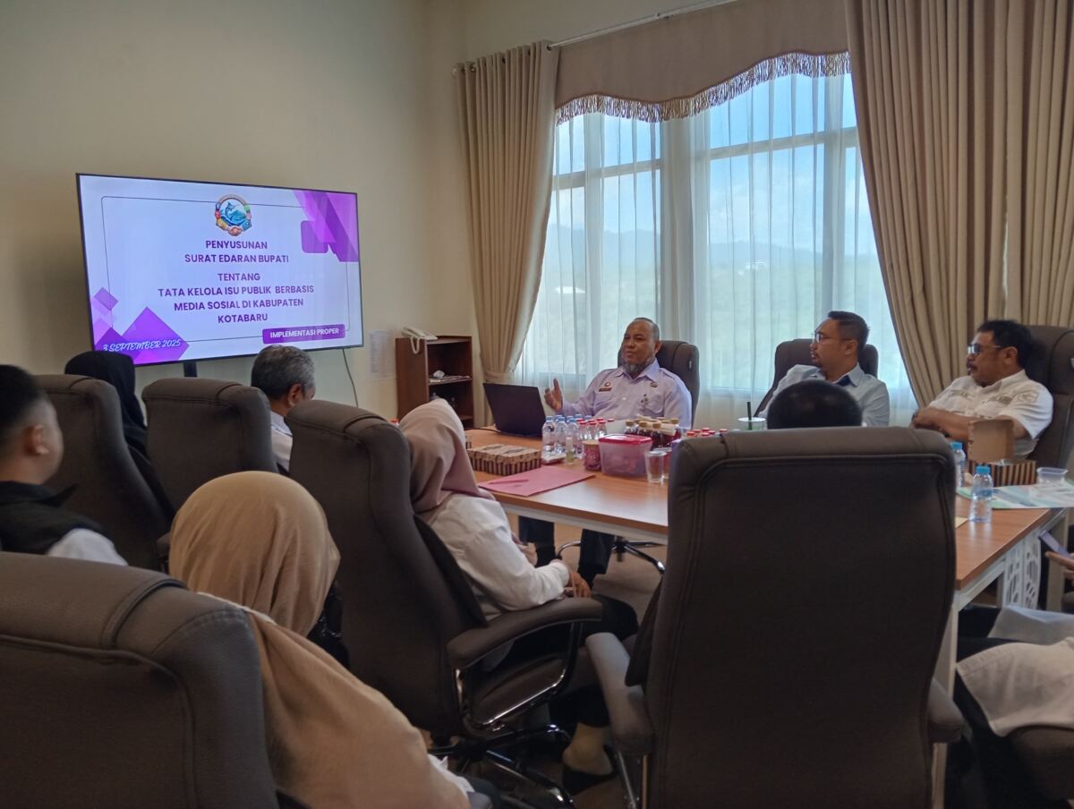 Kegiatan digelar di Ruang Rapat Staf Ahli Bupati Bidang Pemerintahan. Rapat membahas implementasi strategi transformasi tata kelola isu publik berbasis media sosial di Kabupaten Kotabaru.
