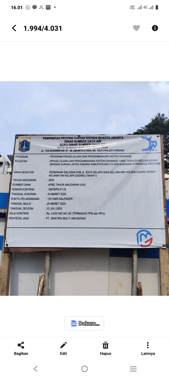 Dan proyek perbaikan turap saluran penghubung yang berlokasi di komplek Gading Janur RT, 01,02 RW 18, Kel. Pegangsaan Dua,